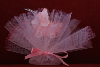 Kinderwagen roze Tule wit met roze rand Tule wit 3 dragees Roze lint Kaartje